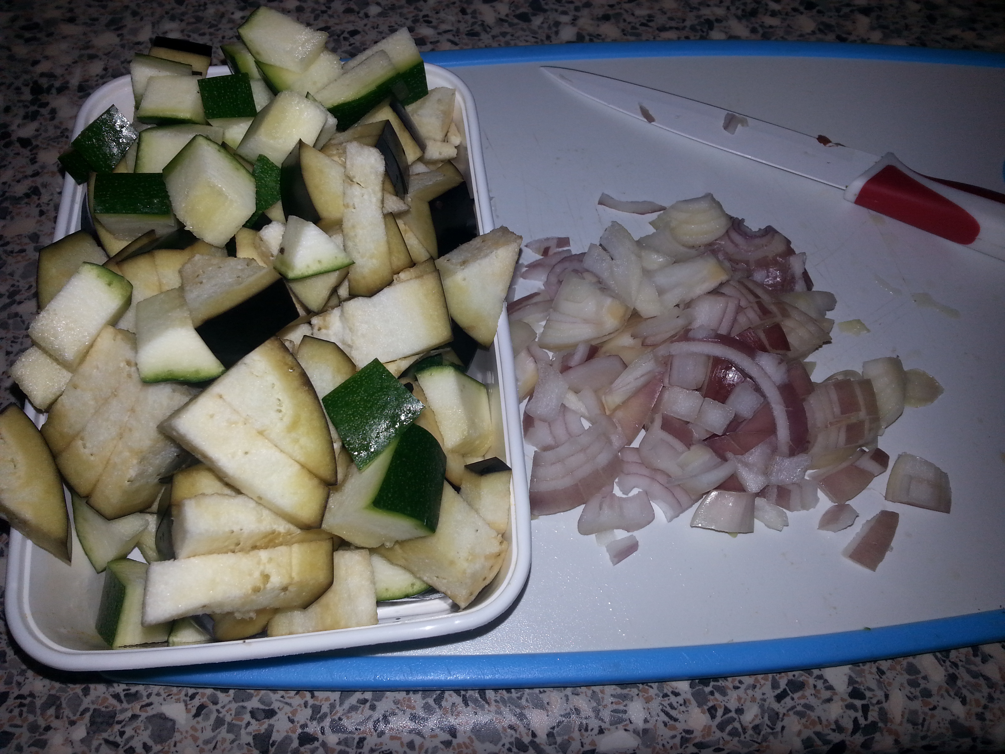 Start with dicing up the Aubergine, courgete and onion.